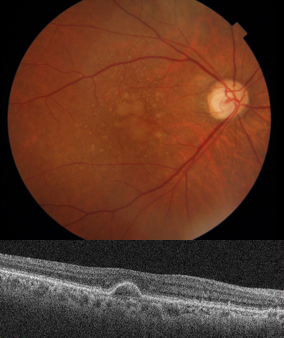眼底に黄白色のドルーゼンと呼ばれる病変が見られる場合があります。